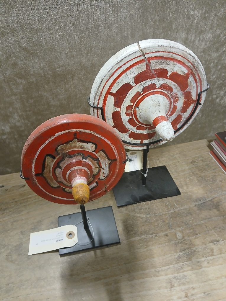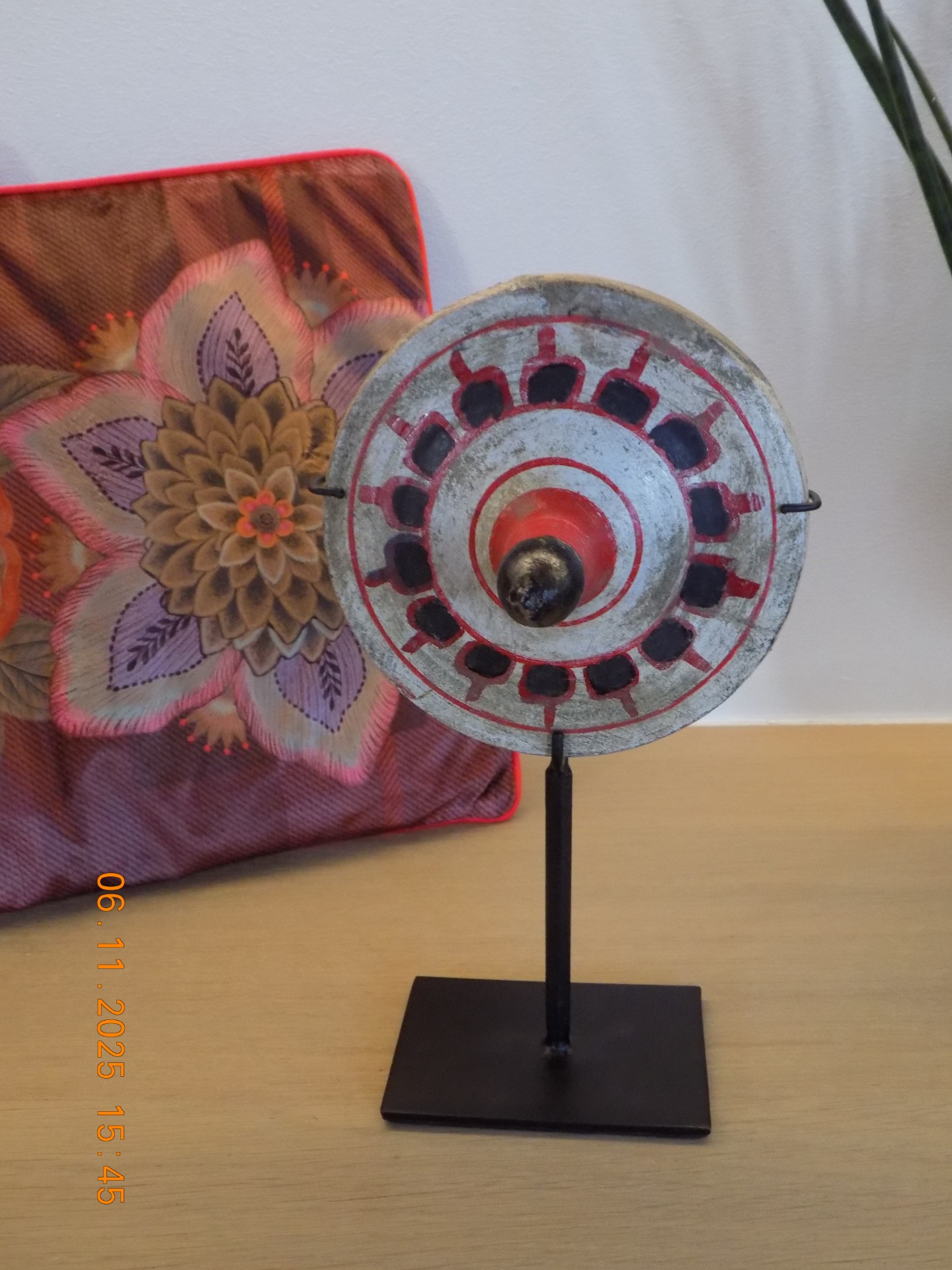 Houten siervoorwerp op voetstuk, uit Indonesië, meer dan 25 jaar oud, in hout, H22 x B12 x D11. Ze worden met de hand gesneden uit hardhout. Traditionele Indonesische kunst. Op metalen sokkel geplaatst. Kunst voor in je interieur.