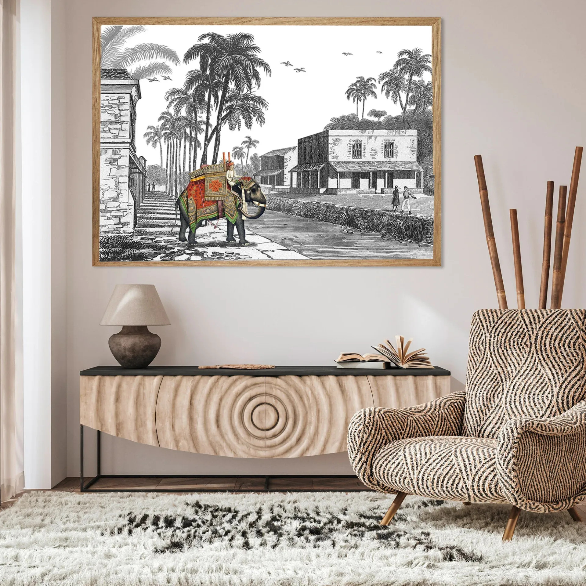 Illustratie met zwarte kader, 50 x 70 cm. Exotische landschappen, mythische ontdekkingsreizen en gepassioneerde reizigers naar verre oorden. Een deel van deze collectie komt van behangdecoraties uit de Franse decoratieve kunsten. Hoogwaardig kunstwerk op dik gestructureerd papier. Fluweelachtige uitstraling en goede kleurdichtheid. Bescherming met kurkplaat voor dit formaat. Paradisio imaginarium.