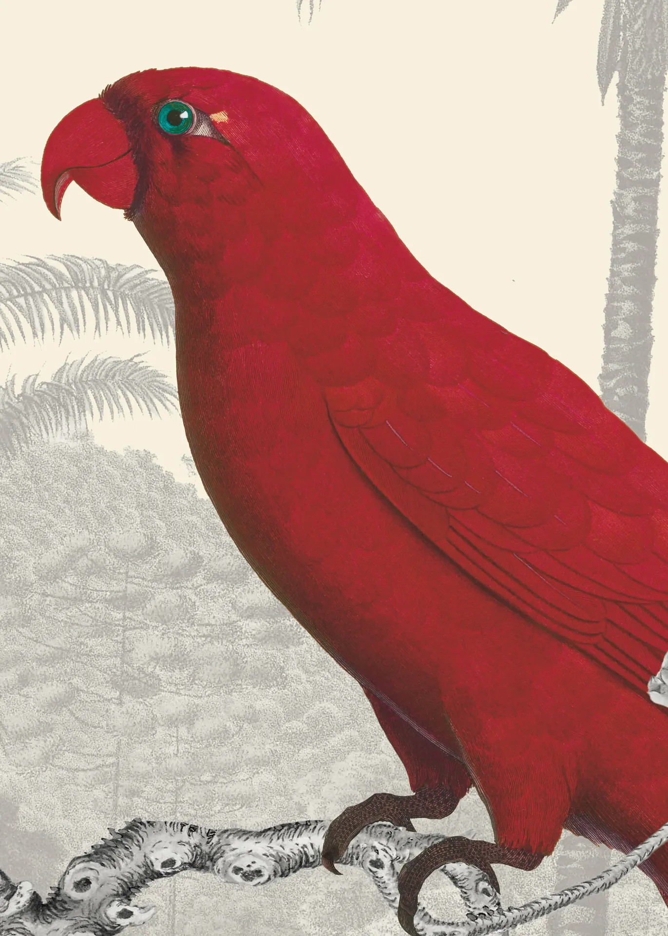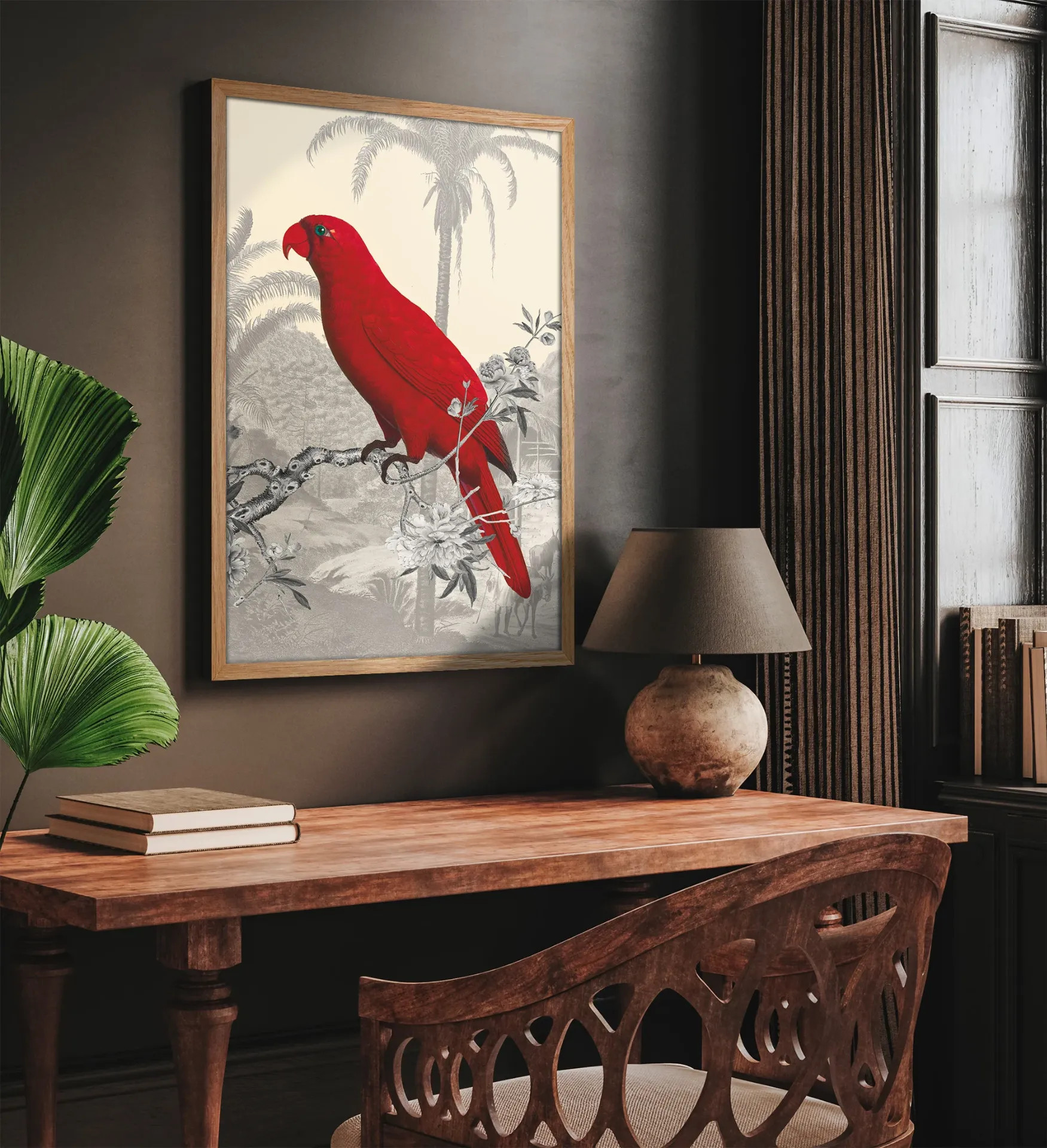 Illustratie 30 x 40 cm met zwarte kader. Papegaaien hebben schitterende kleuren. Deze illustraties komen uit verre ontdekkingsreizen. De rode papagaai komt uit de Molukken in Indonesië. Hoogwaardig kunstwerk op 350gr dik gestructureerd papier , fluweelachtige uitstraling en mooie kleurdichtheid, (bescherming met kurkplaat voor ingekaderde illustratie van 50 x 70 en 70 x 100, kan besteld worden ).Paradisio imaginarium .