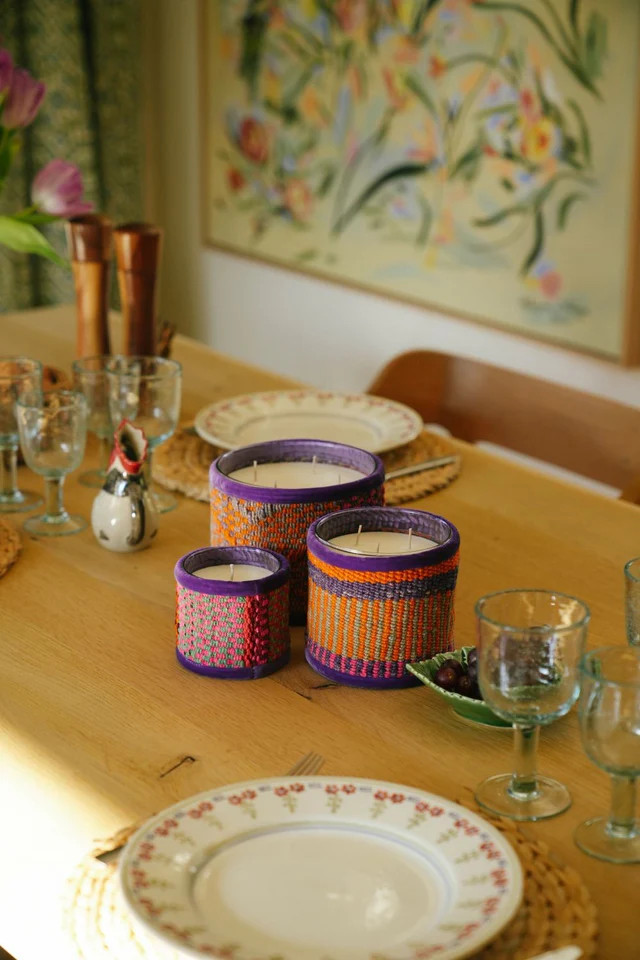Deze kaarsen zijn bedekt met stukjes stof, handgeweven door Peruaanse vrouwen. Elke kaars is uniek en weerspiegelt vakmanschap uit de Andes met heldere en levendige kleuren, Bahia Mala. 12 x 12, 3 lonten, 90 branduren. Ceder, amber en eucalyptus.