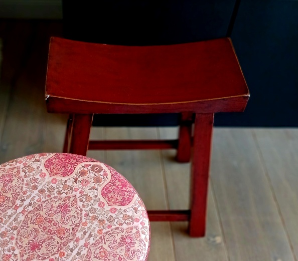 Rode kruk uit gerecycleerd hout, H52 x B50 x D25, met zorg en vakmanschap gemaakt door ambachtslieden uit het Verre Oosten, die eer betonen aan traditionele technieken.